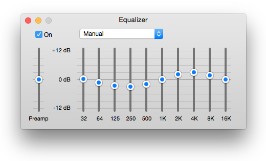 Let’s take a look at the iTunes equalizer (if you have iTunes, just click “Window” and then “Equalizer”). You’ll see a 10-band EQ like the one in the image. Those numbers at the bottom of each slider are the frequencies, for example the slider labelled “32” controls the very low sound around 32 Hz. Our ears generally hear between around 20 Hz and 20 000 Hz (that’s 20 kHz), so this EQ has us covered!